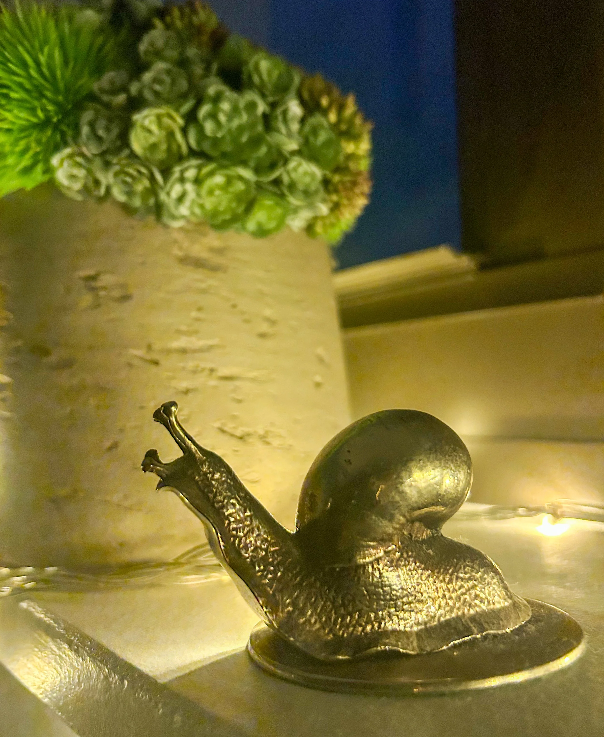 Tessera 43 drops one more coincidence in front of me as my eyes inexplicably find and lock in on the only artifact I brought home from Prague – a quirky $21 metal snail that sits in the windowsill of my kitchen. The shopkeeper where I bought it on Golden Lane, a picturesque row of little colored houses, shared its symbolism when she saw me curiously pick it up.