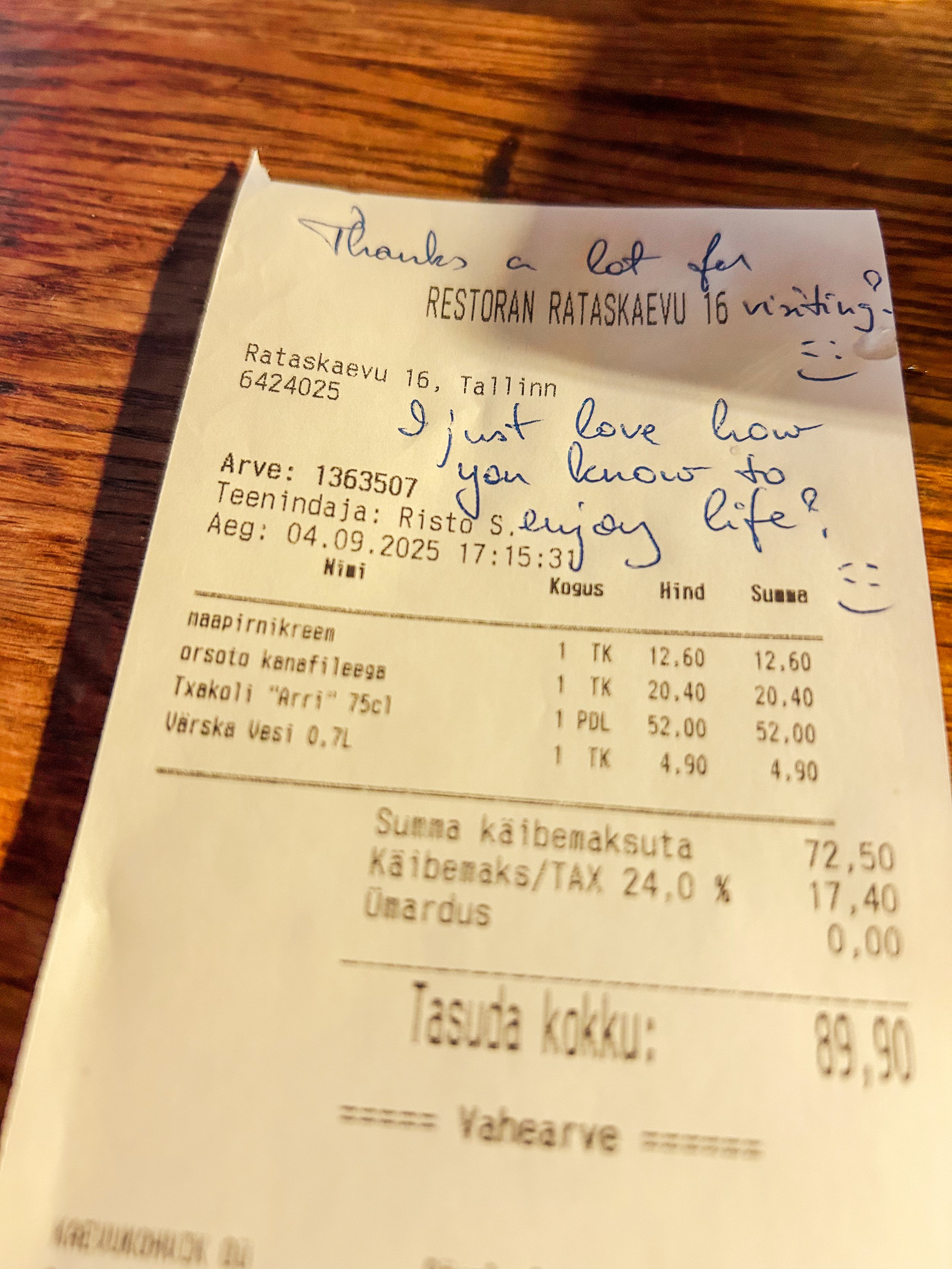 Some of my favorite culinary memories are those that boil down the dining experience to its most essential ingredients – the humans behind the food. That would be the case behind the bites and sips at Restaurant Ratskilva 16. As good as my meal and wine was, what a treat to find Basque Txakoli wine in Estonia, it was the server who left an impression I will not soon forget. He scribbled out a note on my bill, probably nothing to him, but everything to me. His words reinvigorated a shrinking conviction and motivated me to keep moving just as I was.