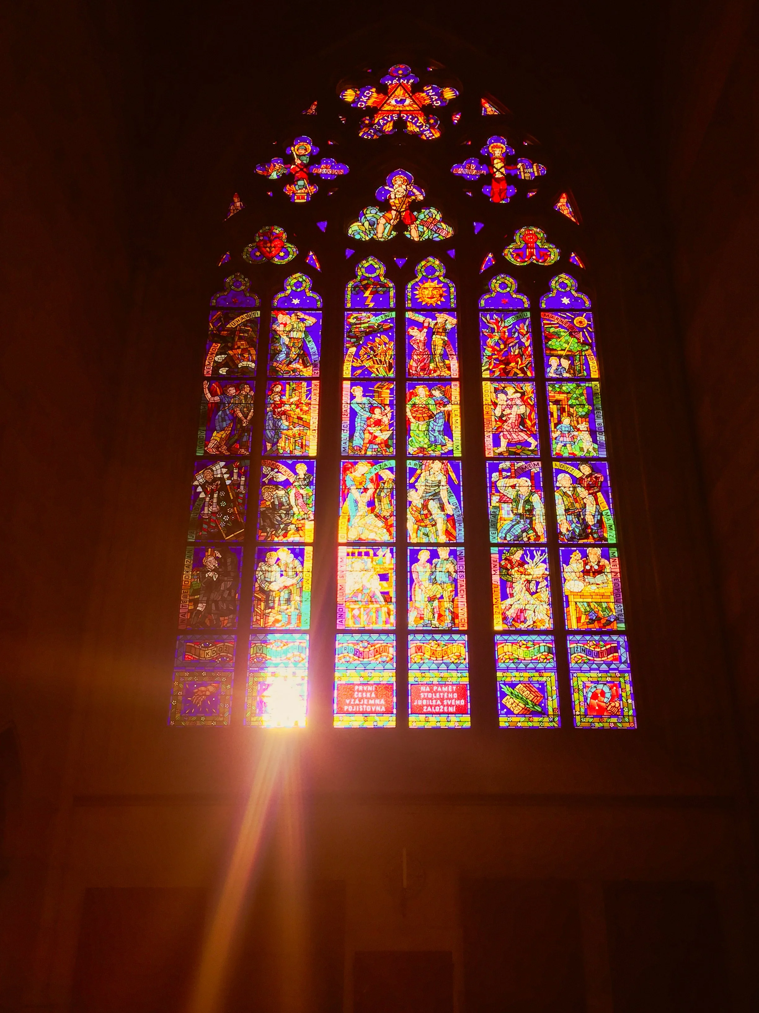 Sunbeam through a stained glass window at St. Vitus Cathedral in Prague, Czechia