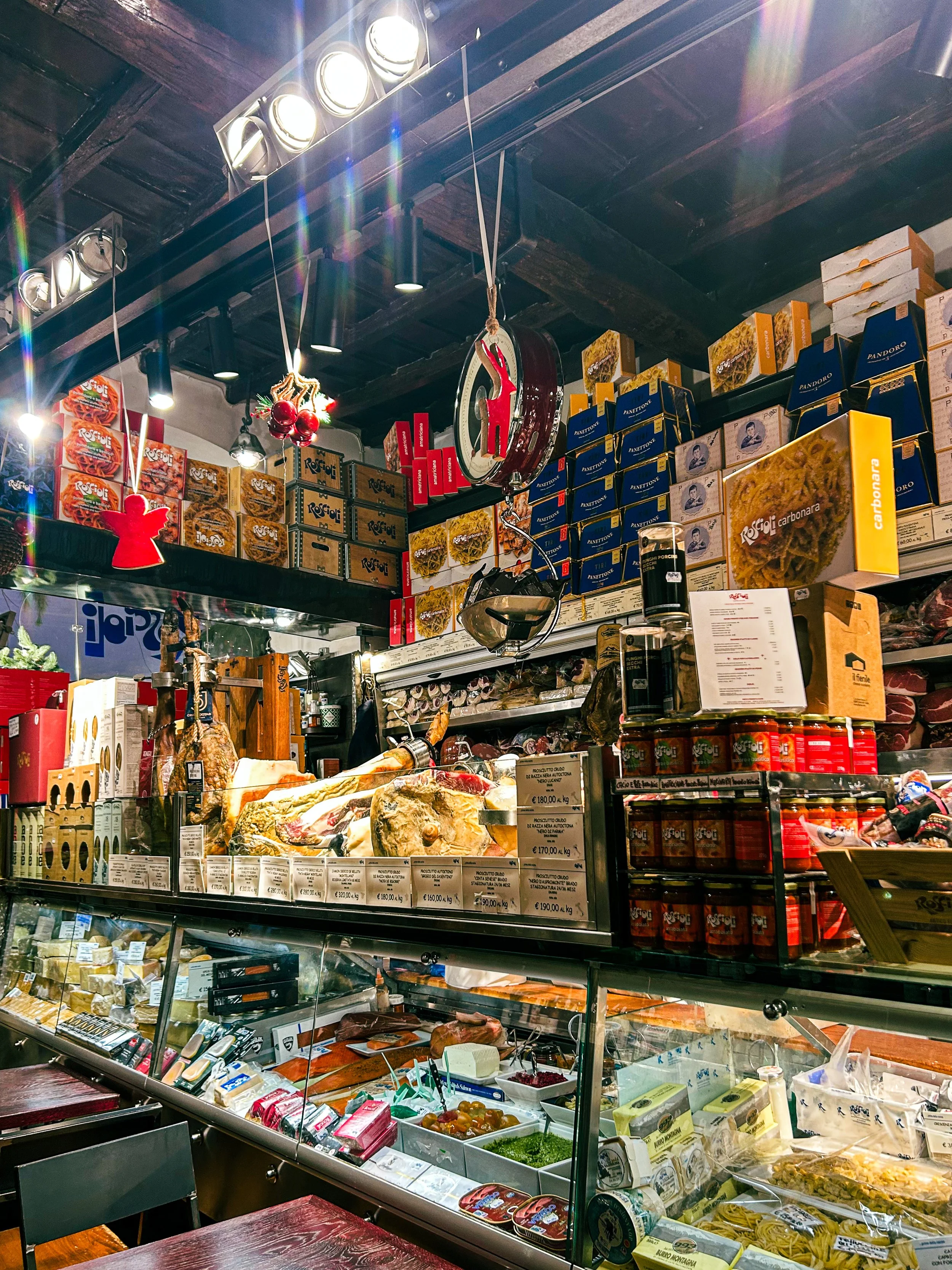 Behind me are towering shelves stocked to the ceiling with Italian goodies – olive oils, sauces, preserves and condiments, biscuits and sweets. On the left, an epic deli counter runs the length of the restaurant’s entrance, glistening with hundreds of types of meats and cheeses. Wines from all over Italy occupy the floor-to-ceiling shelves that face the deli counter, tempting patrons to indulge one last time before they step out into a brisk Roman night.